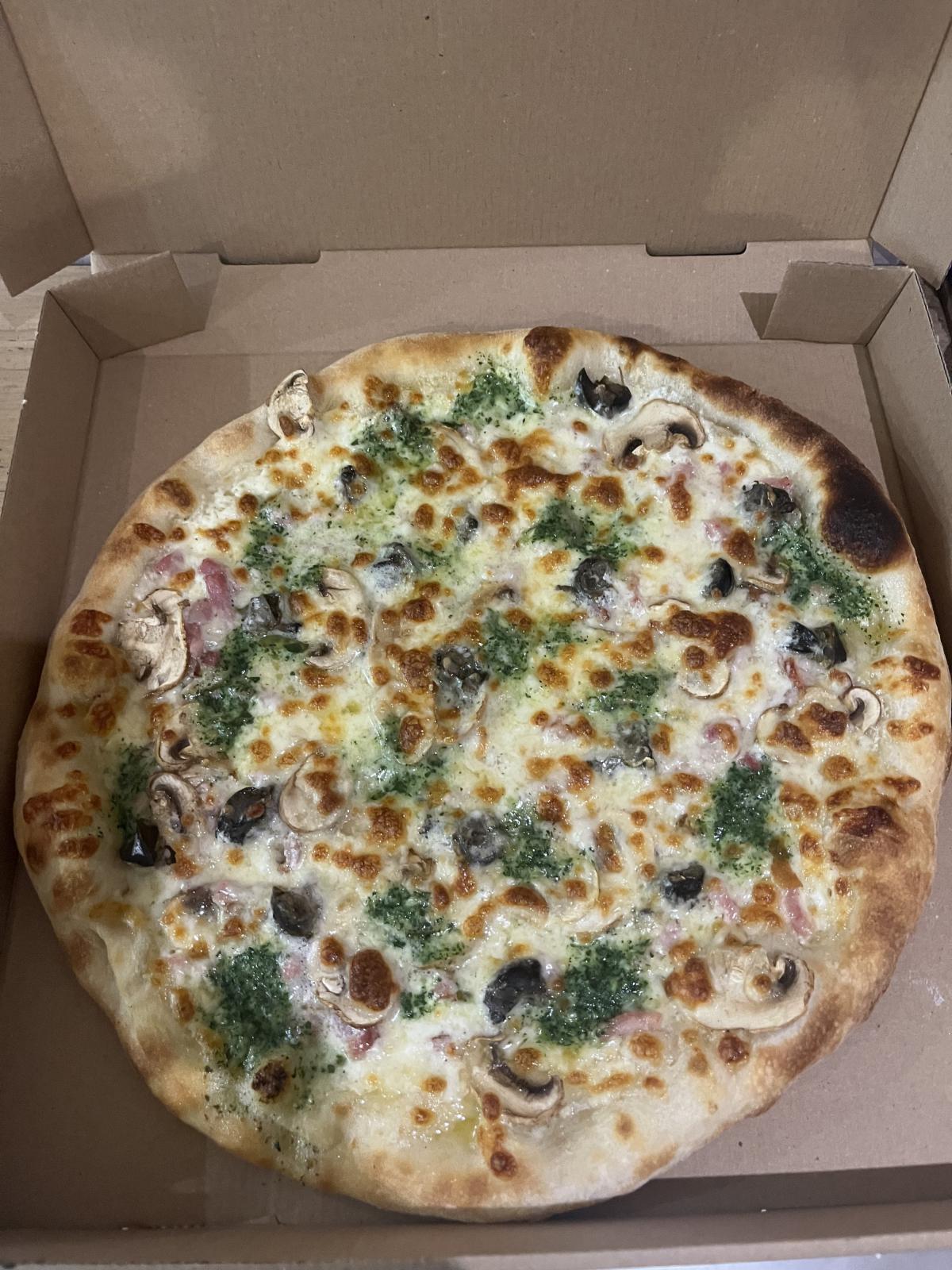 Crème fraîche, poulet, poivron vert, parmesan, sauce pesto basilic, roquette