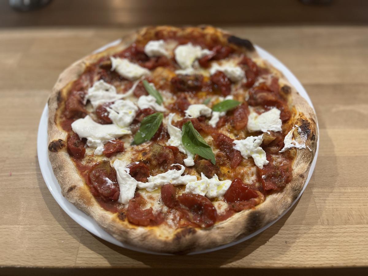 Sauce tomate, aubergines, poivrons, chorizo, origan, mozzarella FIOR DI LATTE, tomates cerises, roquette